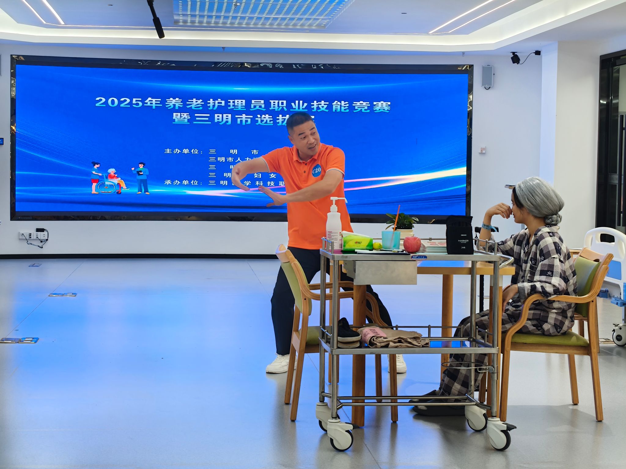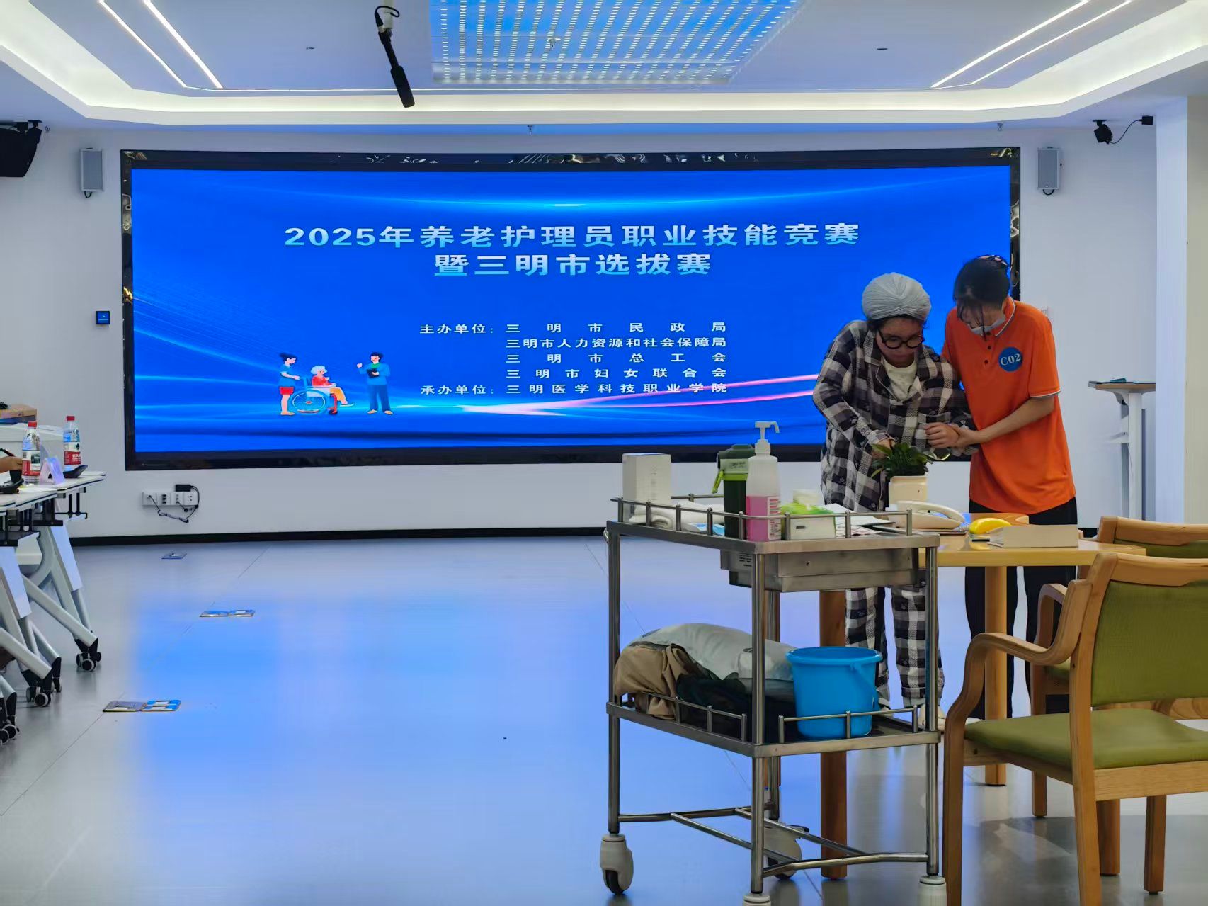 作为本次大赛的承办方,三明医学科技职业学院充分发挥医学与护理系专业办学优势,组建专业筹备团队,按照国家级竞赛标准规划赛场布局、调试实训设备、配备考评专家,邀请国家级裁判及省级专家为大赛提供了标准化的竞赛环境与全方位的服务保障。大赛紧扣养老护理核心需求,采用"理论考核+实操组合赛"的复合竞赛模式,全面检验护理员的专业素养与实践能力。