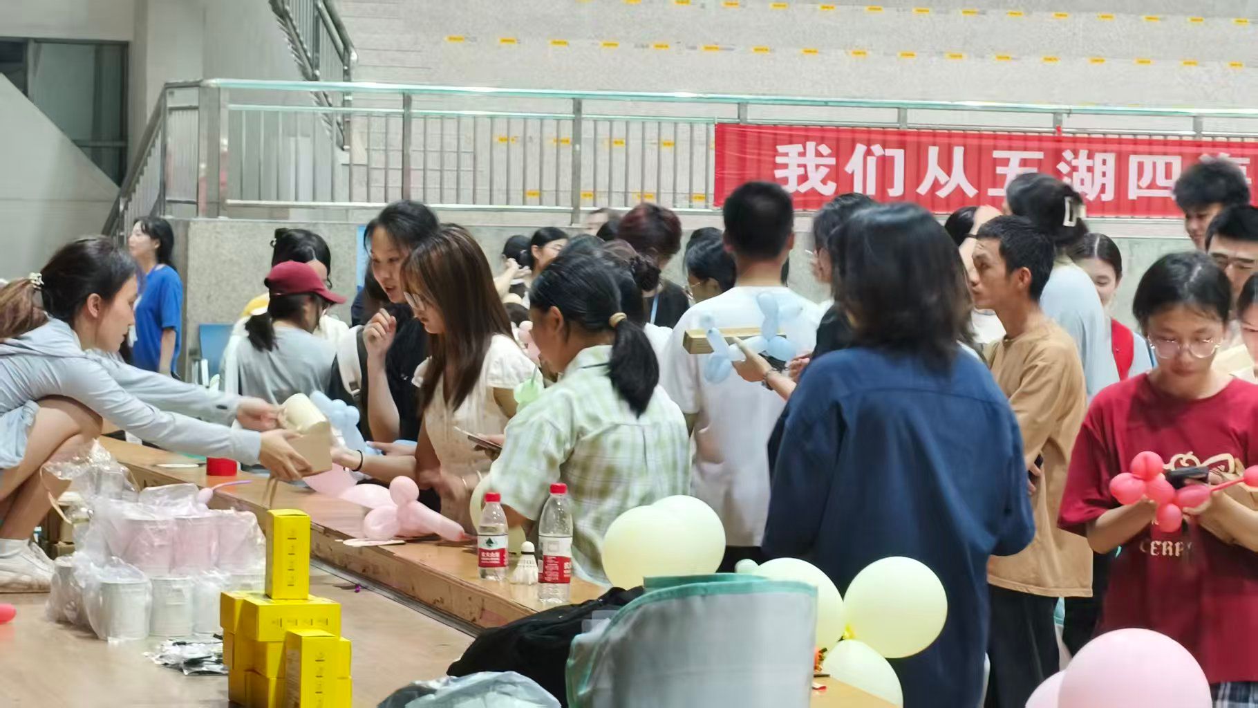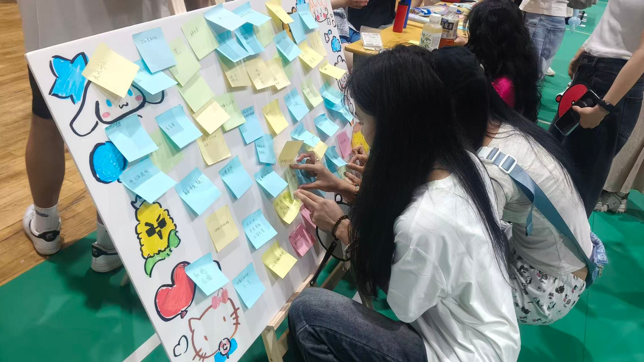 活动设置了五大趣味游戏环节,兼顾情感抒发与团队协作,让同学们在欢笑中释放情绪、凝聚力量。在“解忧杂货铺”游戏中,同学们将心中的愿望与遗憾写在便利贴上,贴满专属展示板,仿佛卸下了心中的“小包袱”,不仅如此,参与者可领取一只气球小狗,这份礼品为活动增添了满满暖意。“心球传递”与“同心动力环”游戏中,同学们默契配合,前者小心翼翼用塑料瓶传递乒乓球,比拼速度与专注力;后者步调一致向终点迈进,诠释着“人心齐,泰山移”的团队精神,两组队伍你追我赶,加油声此起彼伏。“心灵能量圈”环节更具挑战,大家弯腰、侧身、互相协助,每一次成功传递都伴随着欢呼,有效拉近了彼此距离。“默契电波”游戏则充满考验,一人巧妙描述、一人积极猜测,在“不能说关键词”的规则下,凭借默契完成答题,现场不时响起会心的笑声,这不仅锻炼了表达与理解能力,更让友谊在互动中升温。