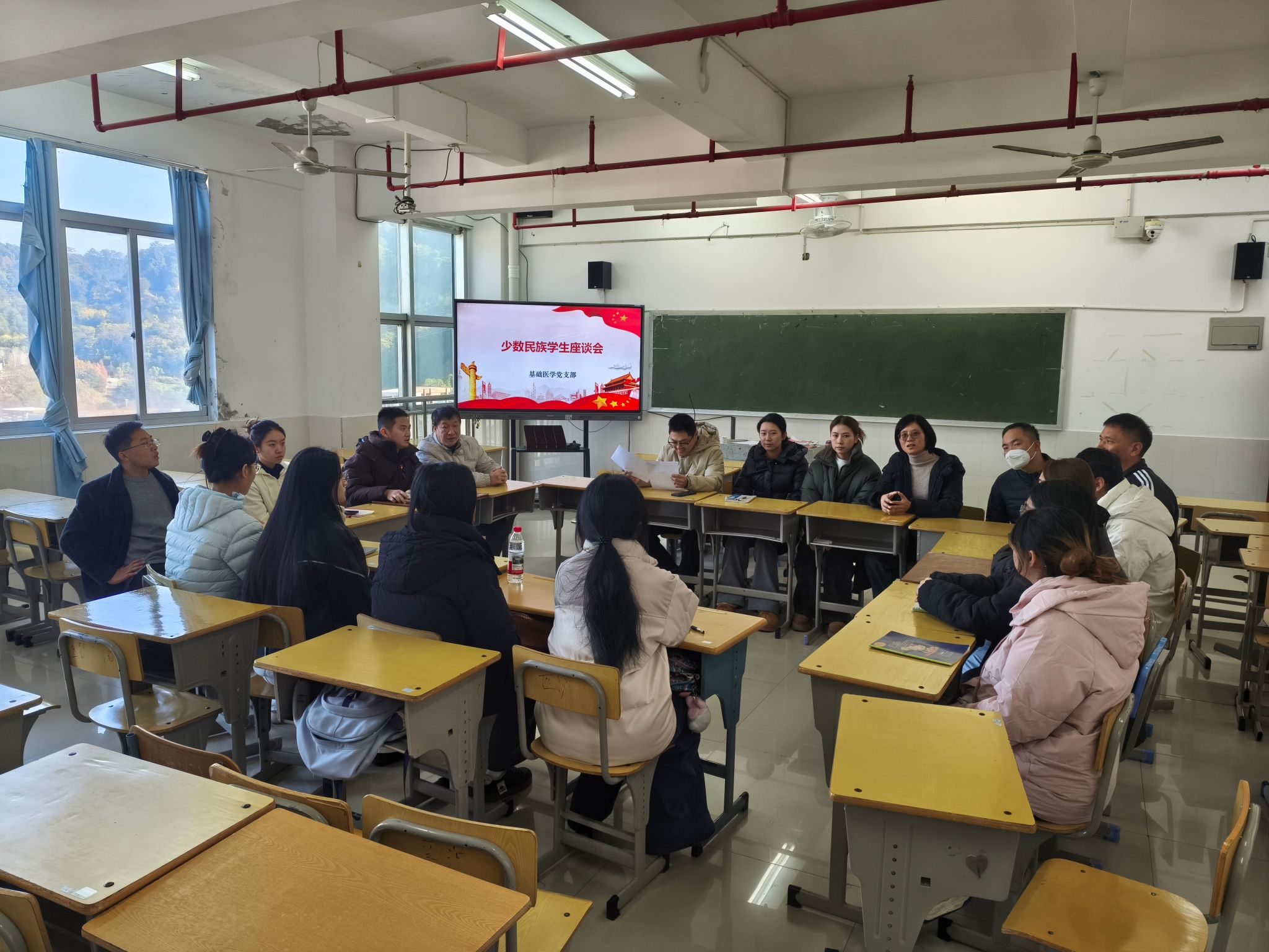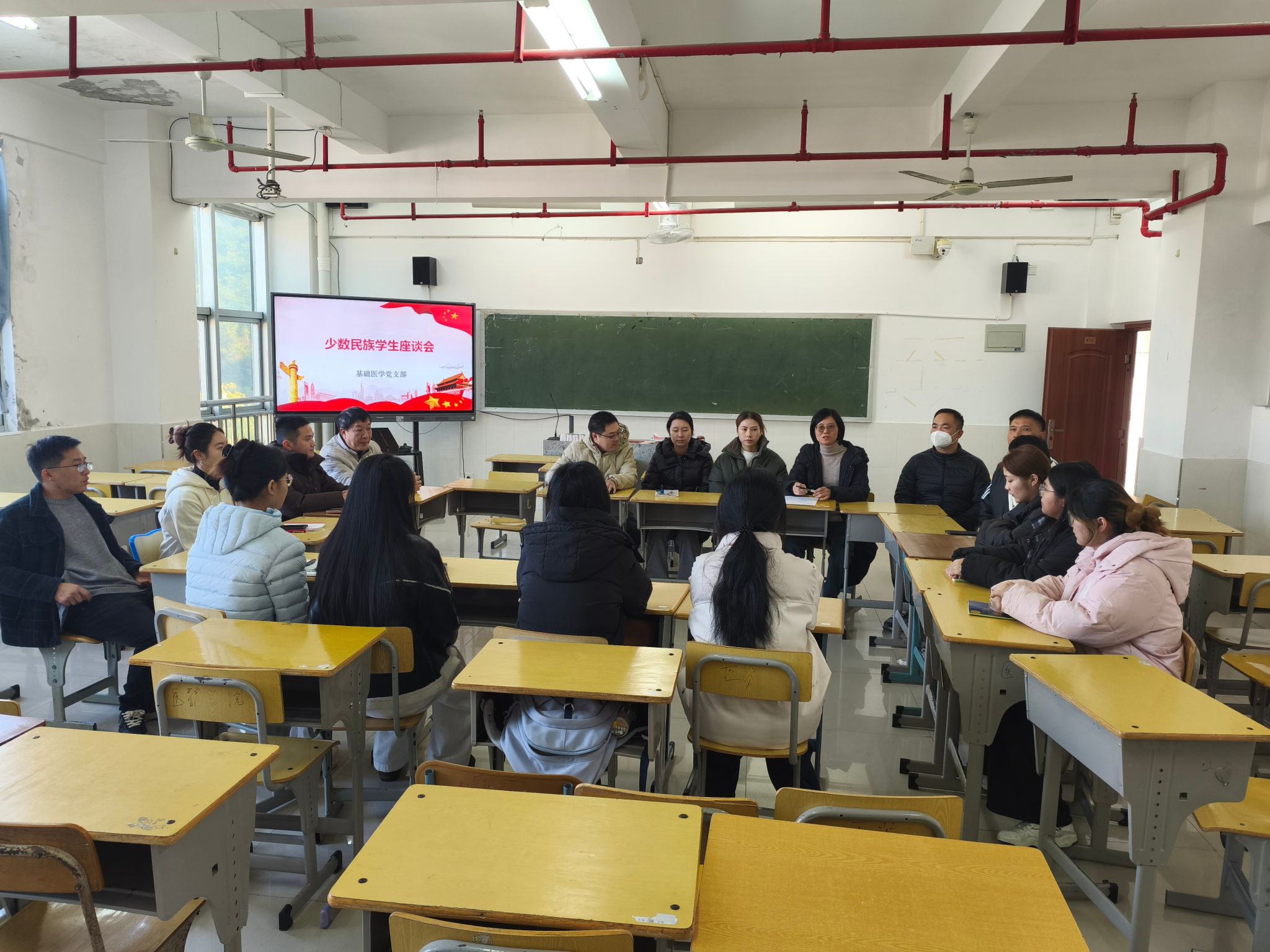 2025年12月15日,基础医学党支部在朱子楼706教室召开少数民族学生座谈会。党支部书记林妙端、支部党员老师及少数民族的学生代表齐聚一堂,围绕学业发展、生活适应、文化融合等话题深入交流,旨在倾听少数民族学生心声,解决实际问题,筑牢民族团结根基。